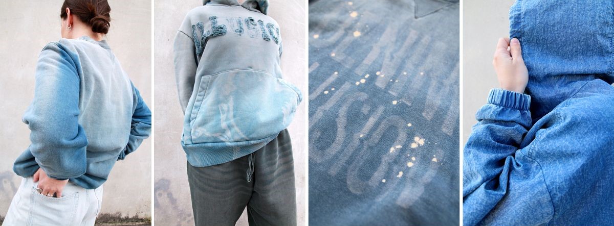 With DyeMate, garments are dyed with indigo through a controlled, low-temperature process, creating a consistent base that naturally responds to subsequent treatments. Alongside indigo pieces, the collection also features ready-to-dye garments treated through Sulfur Essence, where sulfur dyes and indigo combine to recreate the look of discharged and overdyed denim.