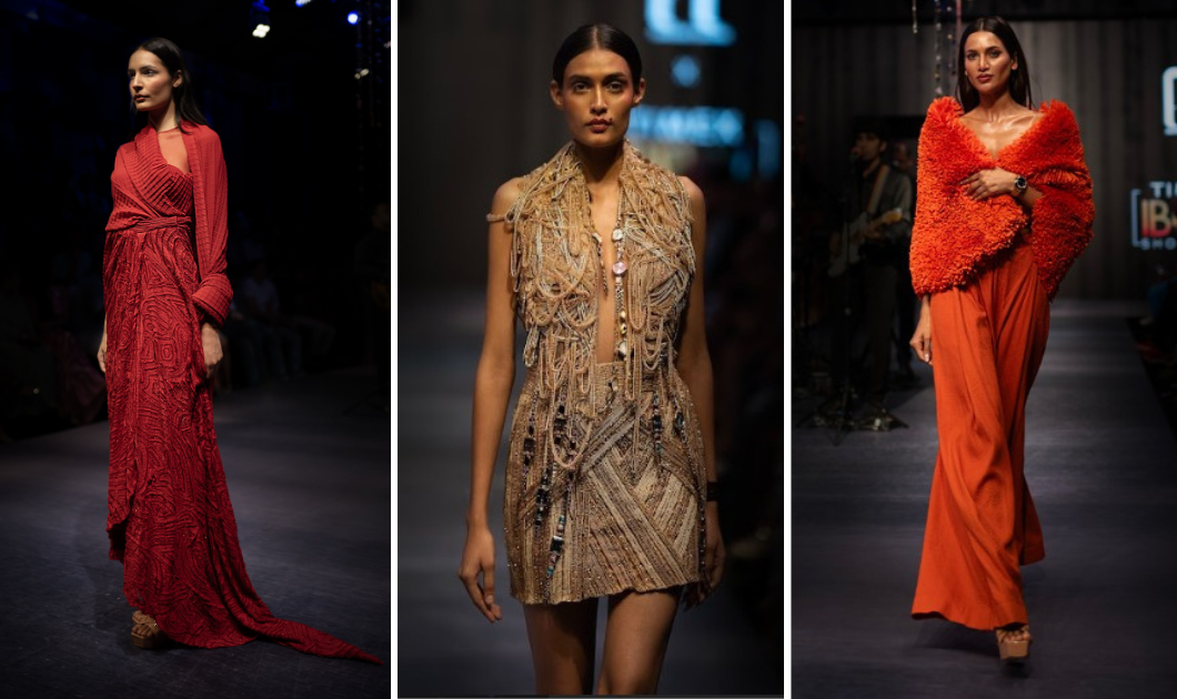 As live jazz music filled the air, the collection unfolded in layers of texture and tone: from light linens and crushed cottons to glimmering lamé and sculpted silks. Each look reflected the duality of life, tactile yet fluid, grounded yet glamorous. Handcrafted artistry took center stage through Kantha embroidery, beadwork, chiffon surface texturing, and 3D embellishment, creating looks that balanced heritage with modern expression. The color story mirrored the refined palette of Timex timepieces, blending earthy browns, metallic silvers, warm golds, and iridescent holographic tones that shimmered under the lights. Every garment echoed the brand’s philosophy of timeless craftsmanship: merging the precision of watchmaking with the emotion of design.