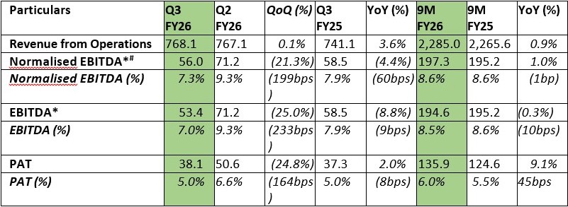 *EBITDA is calculated excluding Other Income; #Normalised EBITDA is adjusted for the one-time impact of increase in employee costs on account of the new labour codes, amounting to c.Rs. 2.6 Cr.