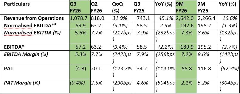 *EBITDA is calculated excluding Other Income; #Normalised EBITDA is adjusted for the one-time impact of increase in employee costs on account of the new labour codes, amounting to c.Rs. 2.7 Cr.