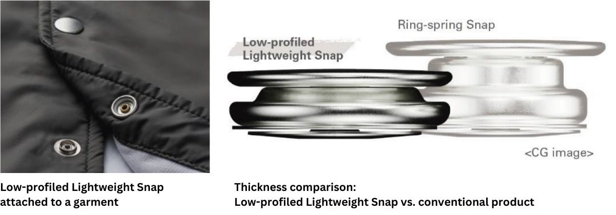 Snap buttons consist of a visible top part (cap) and underparts (socket, stud, post). The newly developed Low-profiled Lightweight Snap features an ultra-slim underpart design and incorporates a plastic spring to ensure optimal functionality. Compared to the conventional Ring-spring Snap (Item Code: SK35), the new snap achieves approximately 16%1 reduction in thickness and about 14% reduction in weight, offering a flat, minimalistic appearance that enhances garment design and expands customer choices. This new product is ideal for activewear and other applications where thinness and lightness are essential.